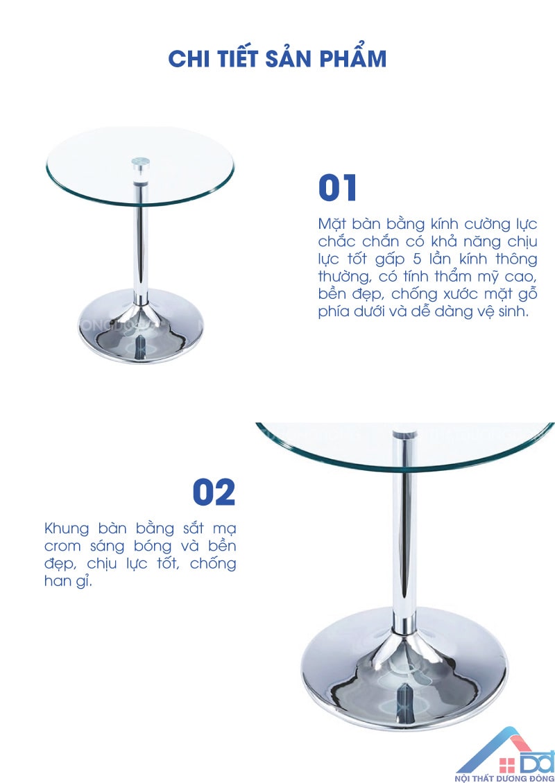 Chất liệu sản phẩm: Mặt bàn làm từ kính cường lực, có khả năng chịu lực tốt hơn gấp năm lần so với kính thông thường, giúp đảm bảo tính an toàn khi sử dụng. Đồng thời, mặt bàn kính có tính thẩm mỹ cao, bền đẹp và dễ vệ sinh. Khung bàn được làm từ sắt mạ crom, mang lại vẻ bóng sang trọng và chịu lực tốt, đồng thời chống han gỉ, giúp sản phẩm duy trì được vẻ đẹp lâu dài.