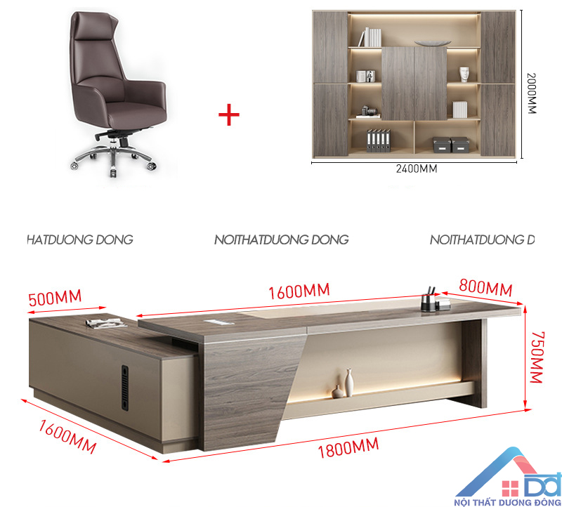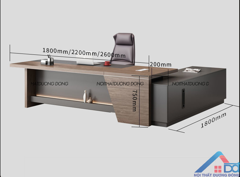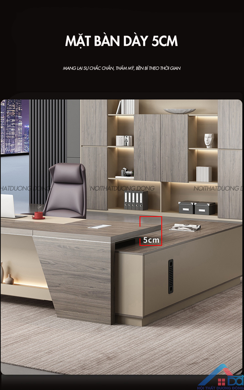 Ngoài ra, tương tự các mẫu bàn hiện đại khác của Dương Đông, bàn làm việc giám đốc luôn được thiết kế tủ phụ rộng rãi, ổ dựng cây máy tính kết hợp ô thoáng tản nhiệt, bảo vệ cây máy và tiết kiệm điện năng. Mặt bàn có nắp nhôm hợp kim dùng để đi ngầm các loại dây, mang lại sự gọn gàng cho không gian làm việc.