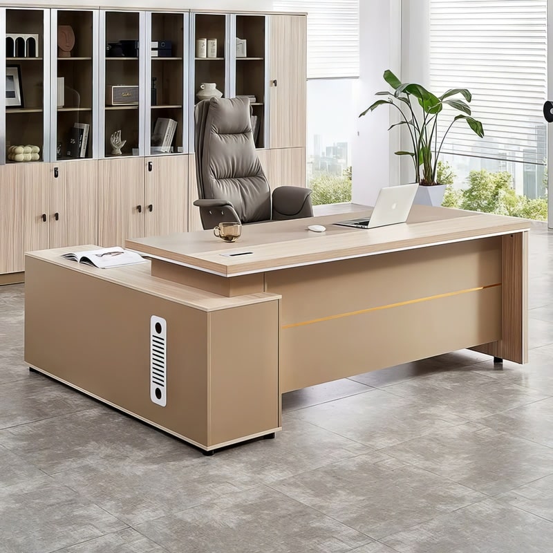 Thiết kế bàn đi kèm tủ phụ tiện ích, được bố trí khoa học giúp người dùng dễ dàng lưu trữ hồ sơ, tài liệu và vật dụng cá nhân. Mặt bàn rộng rãi tạo không gian làm việc thoải mái, đồng thời có thể kết hợp linh hoạt với các vật dụng trang trí như cây xanh, đèn bàn hay máy tính cá nhân mà không gây cảm giác chật chội. Viền bàn được bo tròn an toàn, các chi tiết ghép nối chắc chắn giúp tổng thể sản phẩm thêm phần chỉn chu và thẩm mỹ.