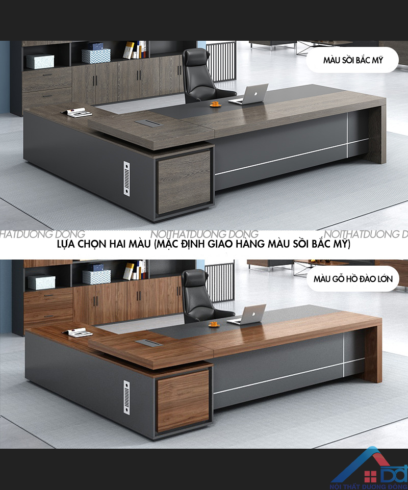 Bên cạnh kiểu dáng, màu sắc cũng là yếu tố quan trọng quyết định tính thẩm mỹ của sản phầm. Đến với nội thất Dương Đông, quý khách hàng sẽ luôn được thoải mái lựa chọn màu sắc theo ý thích. Với mã sản phẩm Bàn giám đốc hiện đại GD 38, chúng tôi cung cấp 2 mã màu thời thượng: màu sồi Bắc Mỹ - vân gỗ phối chì, phù hợp với không gian bố trí tone lạnh, đen xám trung tính; và màu gỗ hồ đào - vân gỗ phối nâu sáng, phù hợp với không gian thiết kế tone trầm ấm.