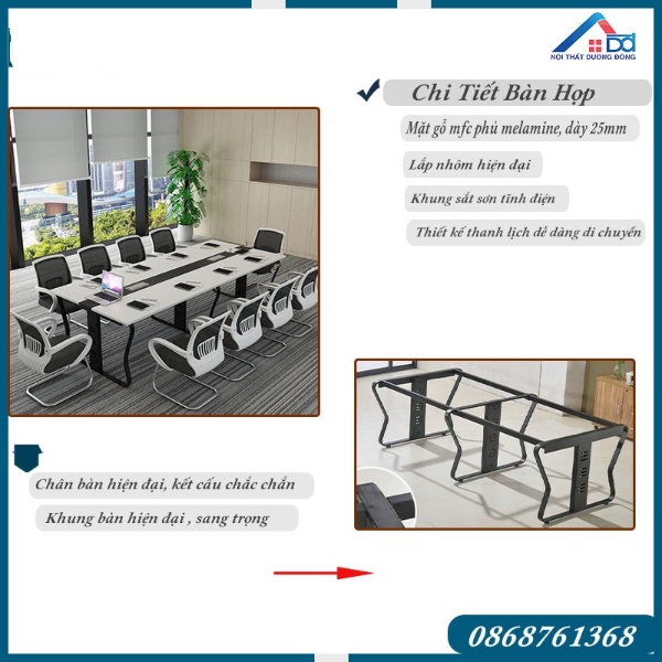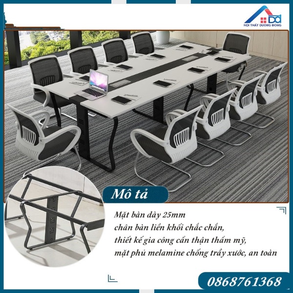 Bàn hội nghị , đàm phán hiện đại là giải pháp lý tưởng cho các cuộc họp và hội nghị. Chân bàn được làm từ sắt, có khả năng chịu lực và giữ vững được trọng lượng của bàn. Bề mặt bàn được phủ lớp melamine chống trầy xước, đảm bảo sự bền vững và dễ dàng vệ sin. Bàn có nhiều kích cỡ và kiểu dáng khác nhau, và có thể được thiết kế với các tính năng đặc biệt để sử dụng trở nên tiện lợi và hiệu quả hơn.