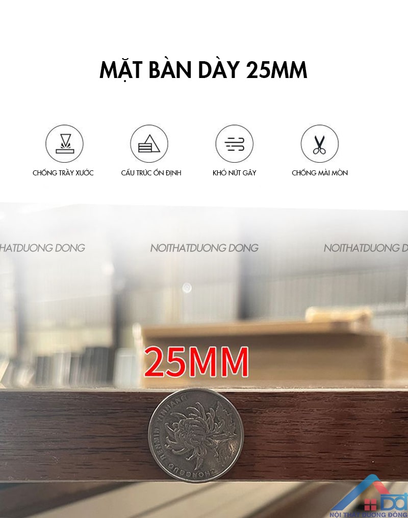 Thiết kế mặt bàn dày lên đến 25mm vô cùng chắc chắn và bền bỉ