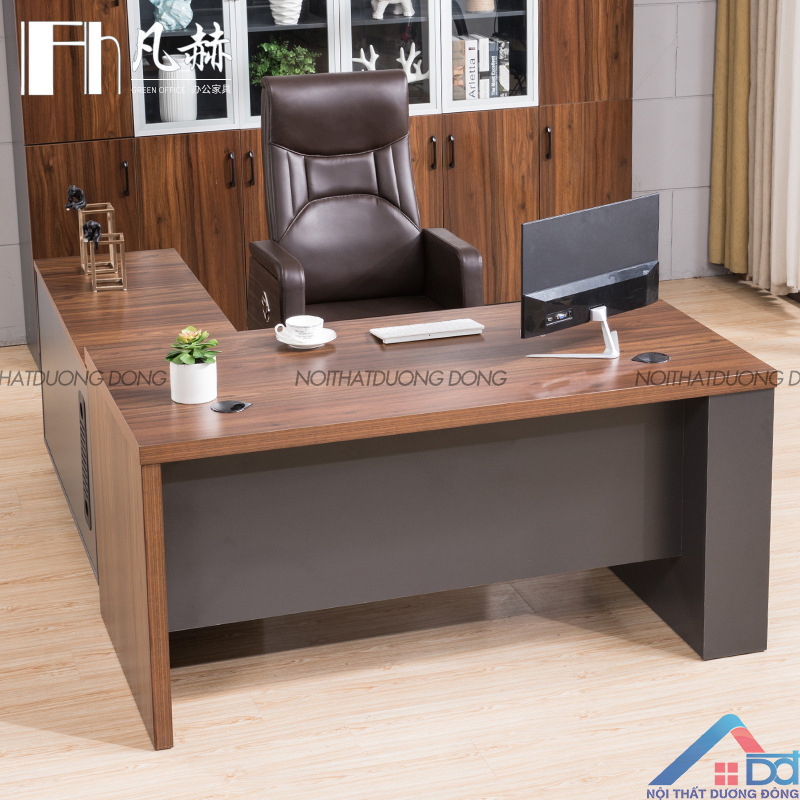 Bàn lãnh đạo kèm tủ phụ hiện đại được làm bằng gỗ công nghiệp MFC phủ Melamine chất lượng cao. Mặt bàn hình chữ nhật, có tủ phụ đi kèm bên bàn, bàn thường được dùng cho lãnh đạo: trưởng phòng, giám đốc,.…thuộc dòng bàn cao cấp của Nội thất Dương Đông.