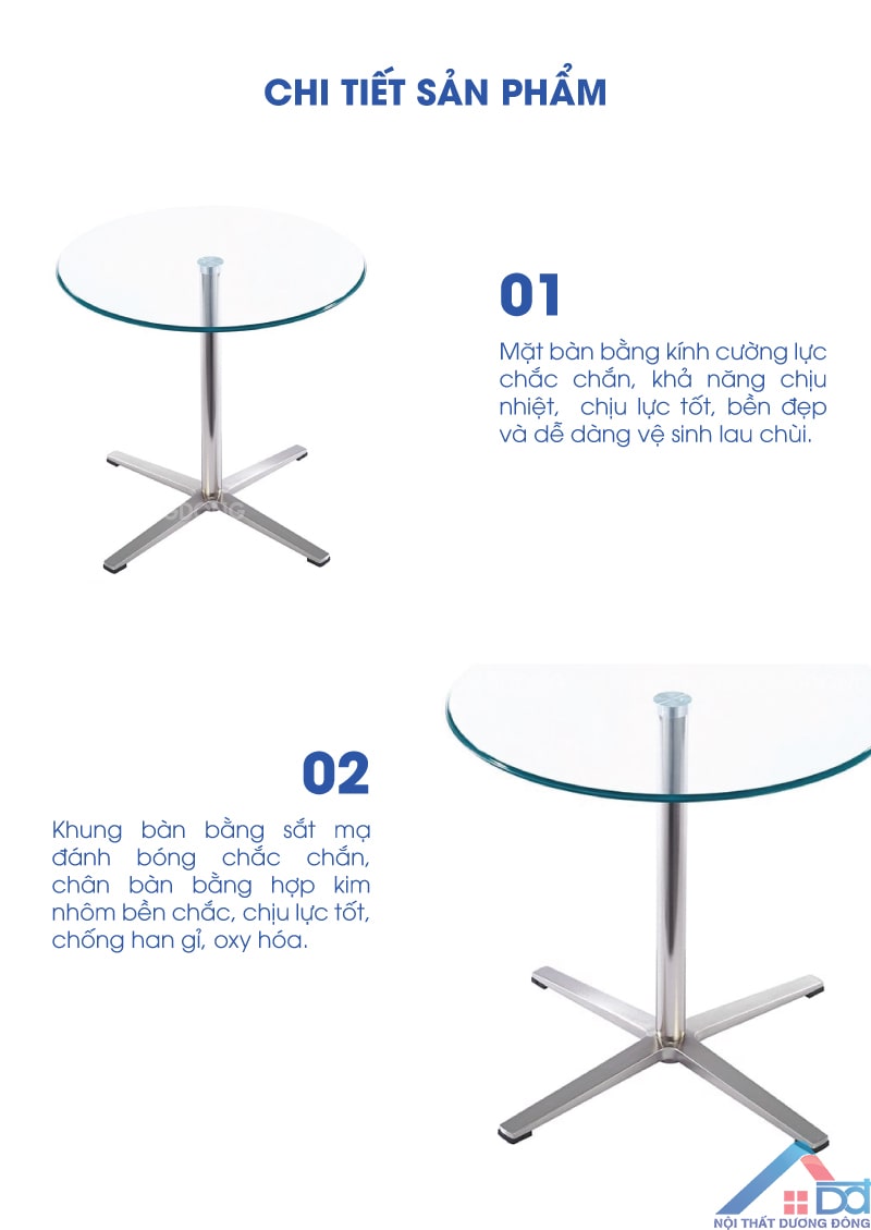 Chất liệu: Khung bàn bằng sắt mạ đánh bóng chắc chắn, chân bàn bằng hợp kim nhôm bền chắc, chịu lực tốt, chống han gỉ, oxy hóa. Mặt bàn bằng kính cường lực chắc chắn, khả năng chịu nhiệt, chịu lực tốt, bền đẹp và dễ dàng vệ sinh lau chùi.