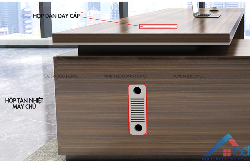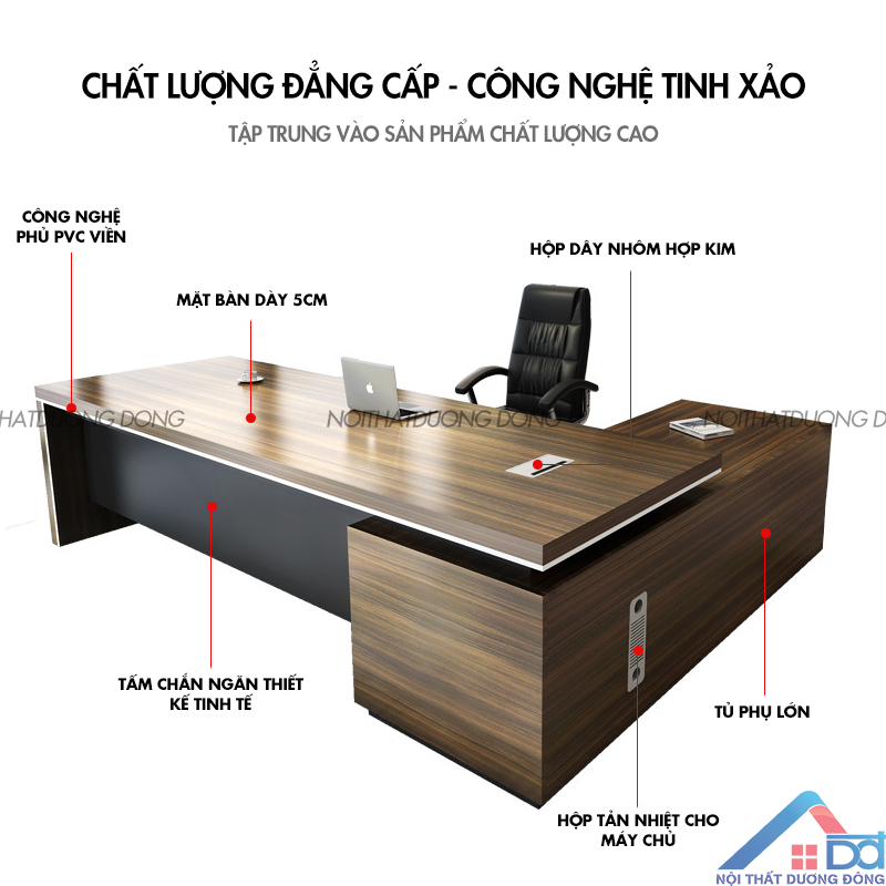 Nội thất văn phòng thế hệ mới luôn hướng đến sự thanh toát, tiện nghi và tối giản nhưng không hề đơn điệu. Bàn trưởng phòng hiện đại Dương Đông với kích thước mặt bàn rộng rãi, mặt bàn dày 5cm với viền được phủ PVC cực kì chắc chắn. Tủ phụ lớn, bố trí vuông góc với cạnh bàn kèm hộp tản nhiệt đựng cây máy chủ và hộp dẫn dây cáp nối lên mặt bàn - đây là thiết kế mới đột phá so với những dòng bàn làm việc cũ trước đây, mang lại sự tiện dụng và góp phần tăng hiệu quả công việc.