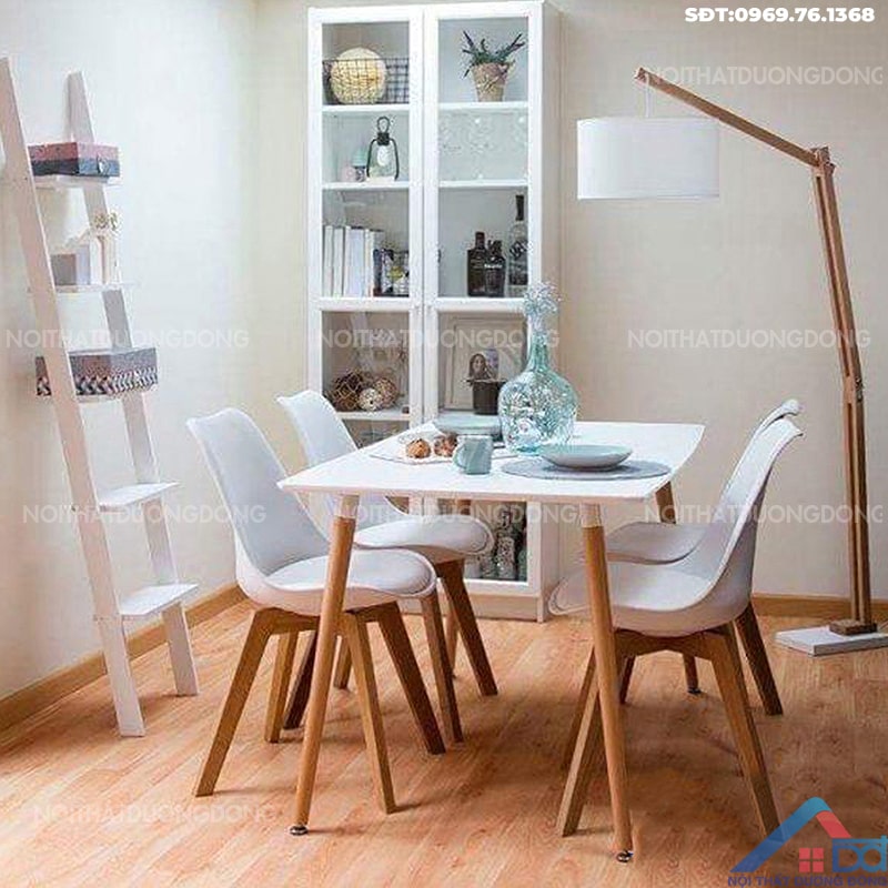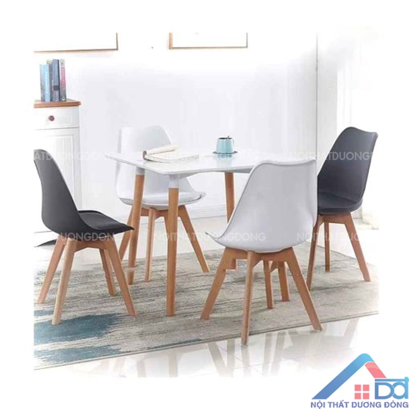 Chất liệu: Bàn (Mặt gỗ sơn trắng, khung sắt sơn tĩnh điện, chân gỗ beech tự nhiên) ; Ghế (Mặt nhựa plastic cao cấp + nệm ngồi da + chân gỗ beech tự nhiên)