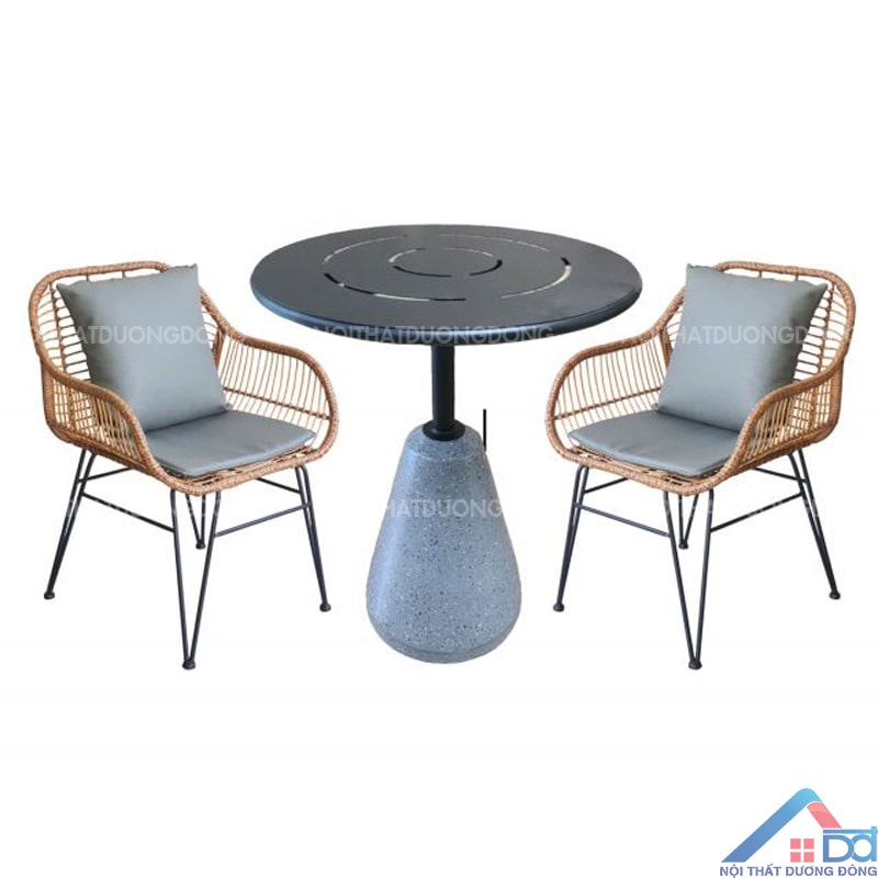 Chất liệu: Mặt bàn sắt dày 1.5ly, đế chân bê tông đá mài. Chất liệu ghế Nhựa giả mây tròn. Nệm simili. Khung chân sắt sơn tĩnh điện.