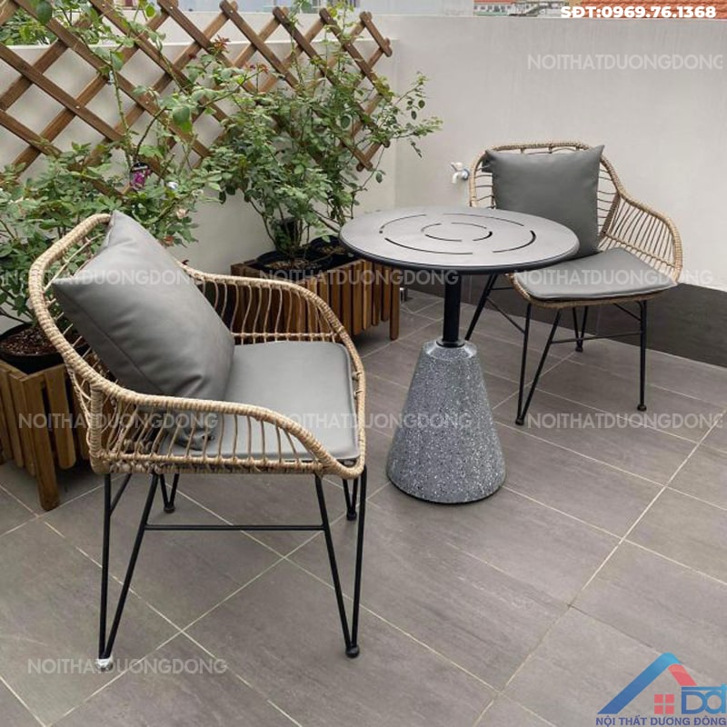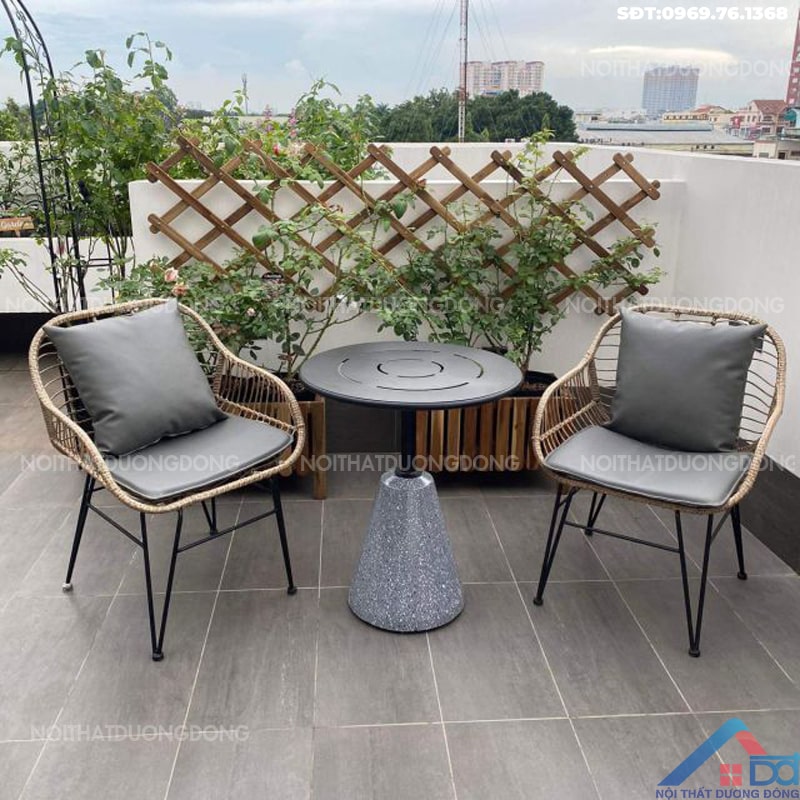 Chất Liệu Bền Bỉ: Sản phẩm được làm từ các vật liệu chất lượng cao như sắt dày 1.5ly, đế chân bê tông đá mài, nhựa giả mây và nệm simili. Điều này đảm bảo sự bền bỉ và độ ổn định của sản phẩm trong mọi điều kiện thời tiết khắc nghiệt.