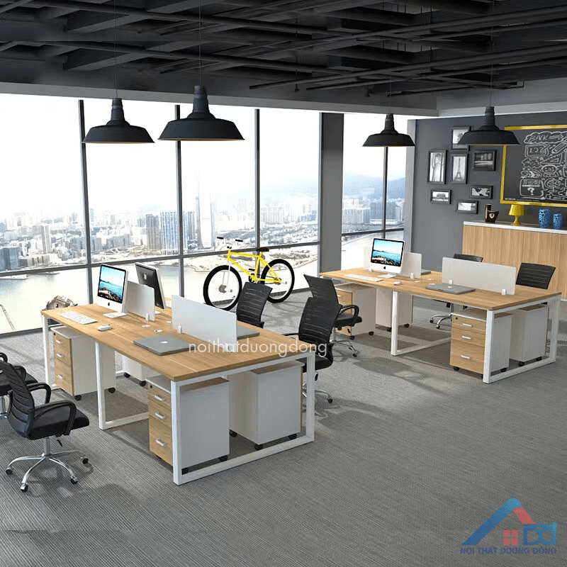 - Bàn được thiết kế với các vách ngăn bằng gỗ công nghiệp tiện lợi, tạo không gian riêng tư cho từng cá nhân khi làm việc.