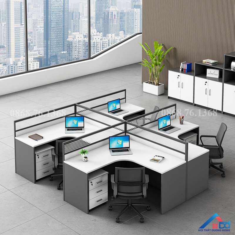 Thiết kế chữ L của CB 49 không chỉ giúp tận dụng tối đa diện tích văn phòng mà còn mang lại một khu vực làm việc rộng rãi, đa năng. Người dùng có thể bố trí màn hình máy tính, tài liệu, văn phòng phẩm ở nhiều góc khác nhau mà không cảm thấy chật chội. Với bố cục hợp lý, cụm bàn cũng cho phép bố trí linh hoạt từ 2, 4 đến 6 chỗ ngồi tùy theo nhu cầu sử dụng của từng văn phòng, phù hợp cho cả nhóm làm việc nhỏ hoặc đội nhóm lớn.