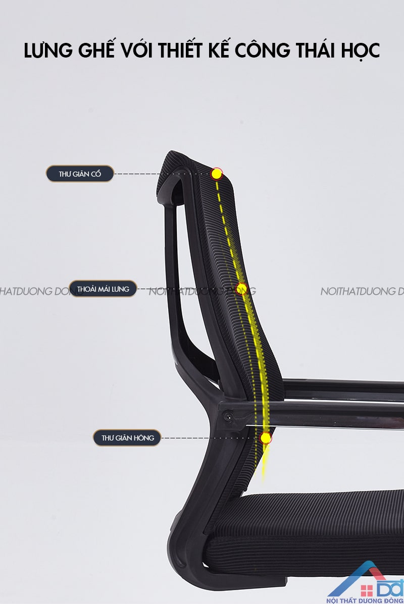 Lưng ghế với thiết kế công thái học giúp thư giãn cổ, thư giãn hông, hạn chế tối đa hiện tượng cong vẹo cột sống, đau lưng