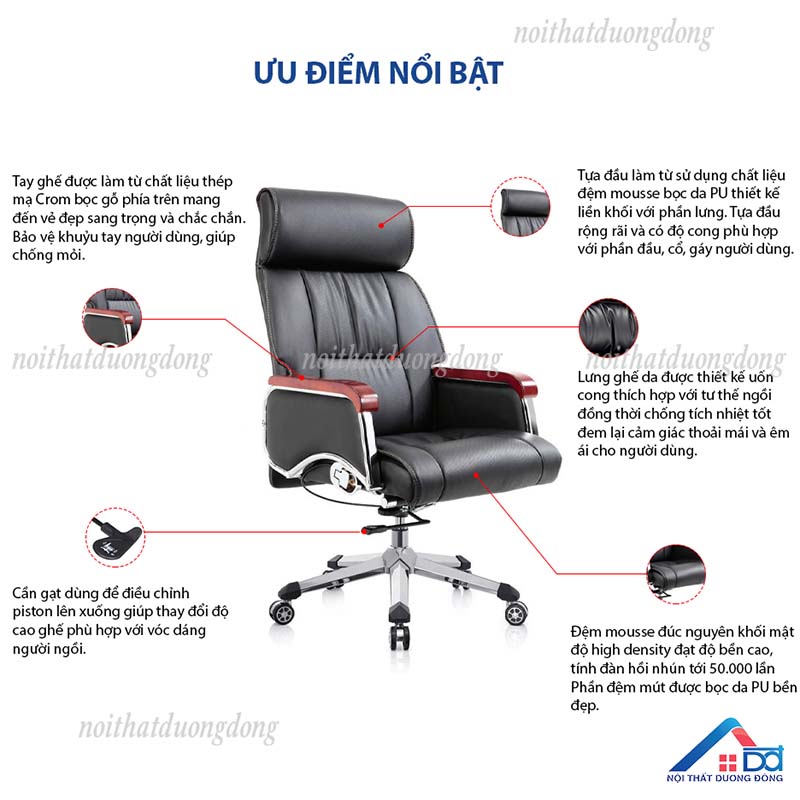| Gia công cao cấp | Chân ghế được thiết kế mạ crom cao cấp, khung chân đa giác thiết kế độc quyền, bền, chắc, chịu tải trọng lên tới 200 kg. |