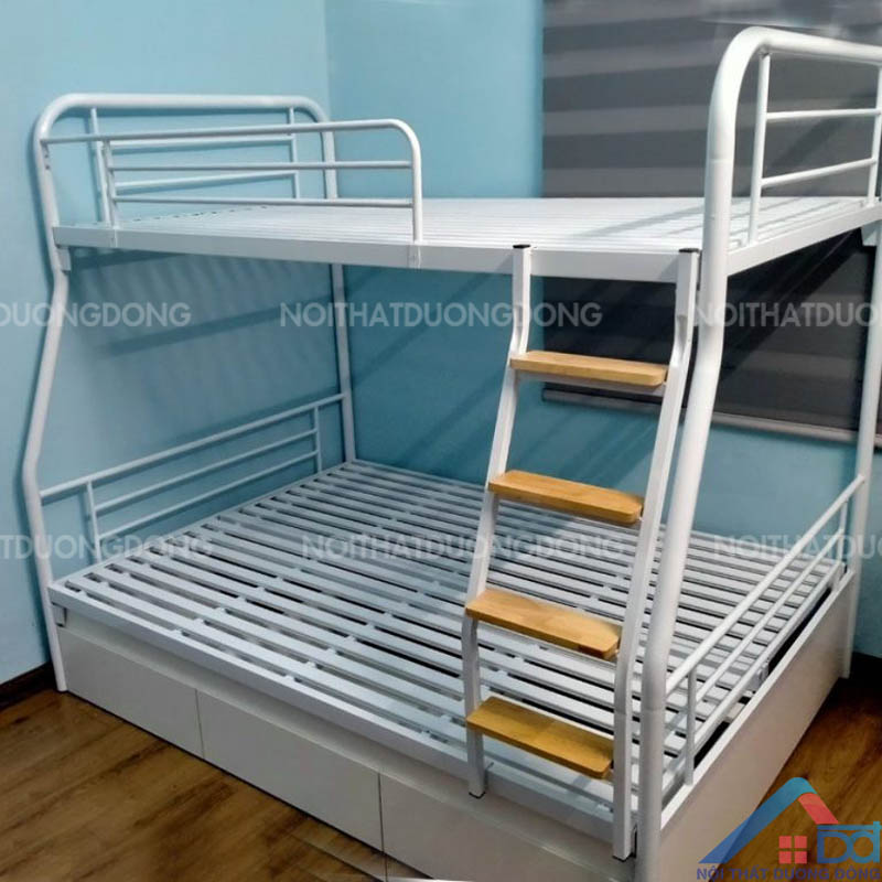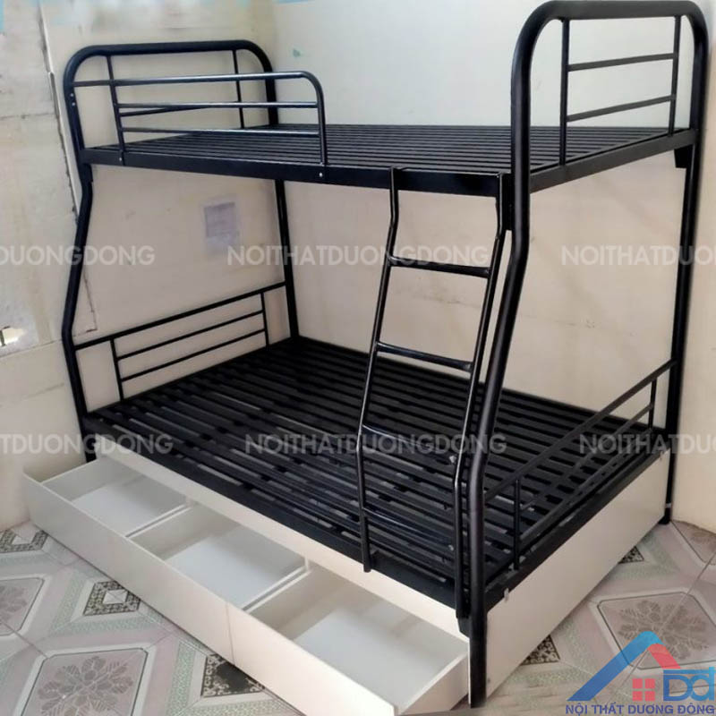 + Ngoài không gian để ngủ, thì khu vực ở dưới cùng còn được thiết kế thêm ngăn kéo gỗ vô cùng tiện dụng. Chất liệu của ngăn kéo bằng gỗ MDF được phủ melamin giúp cho bề mặt của gỗ luôn được mới mẻ, chống trầy xước, đồng thời hạn chế được hiện tượng ngấm nước. Hộc tủ này có chức năng rất lớn trong việc cất giữ đồ đạc cá nhân. Giúp cho không gian giường ngủ trở nên gọn gàng và ngăn nắp hơn.