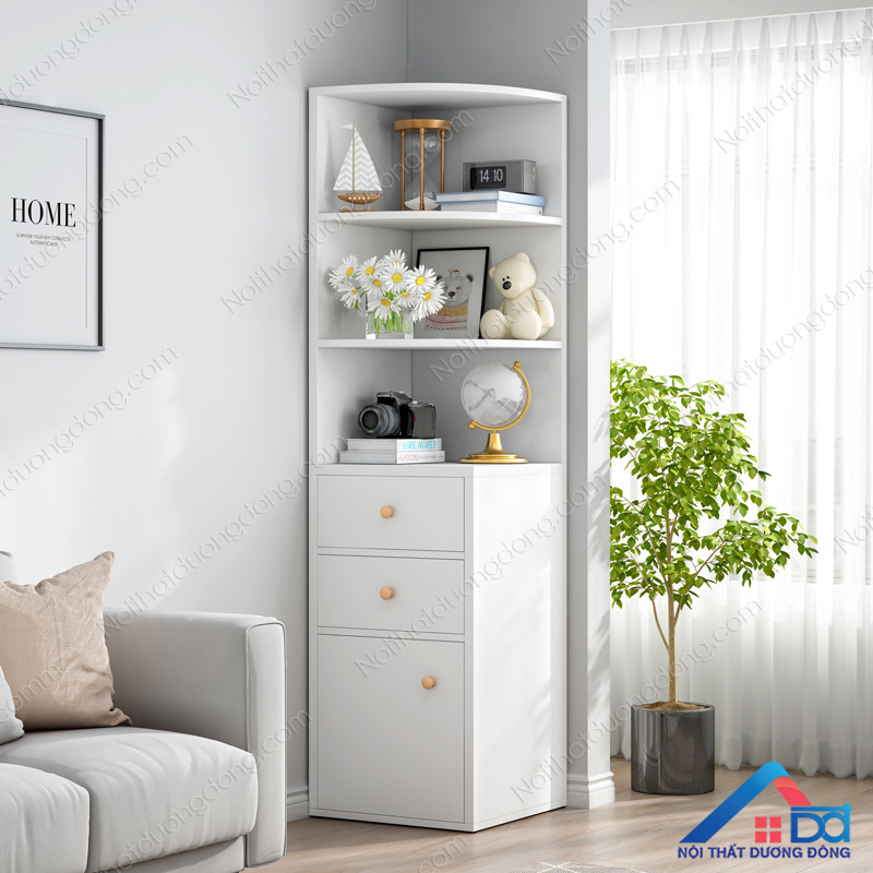 Kệ trang trí góc tường hiện đại để sách hoặc đồ trang trí ở phòng khách, văn phòng ,kệ làm bằng gỗ công nghiệp . Kệ trang trí góc tường hiện đại có thiết kế kiểu đứng thường được dùng để sách hoặc các đồ trang trí phù hợp với vị trí góc trong không gian phong học tập hay phòng khách.