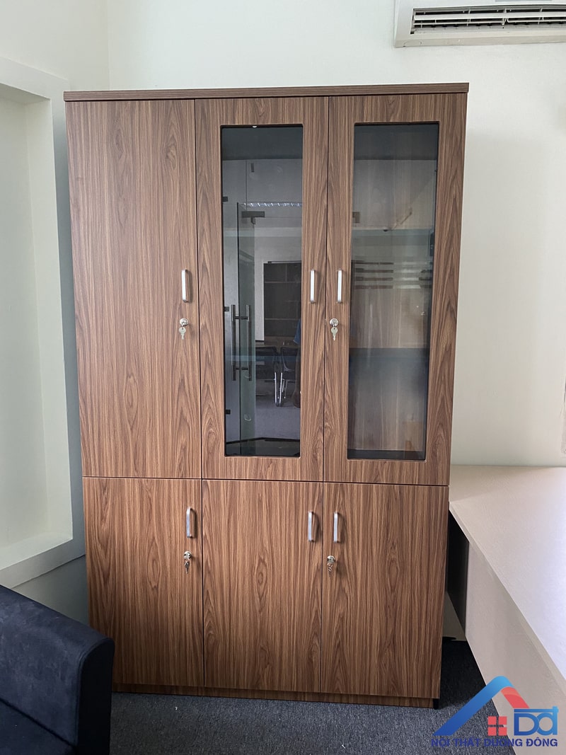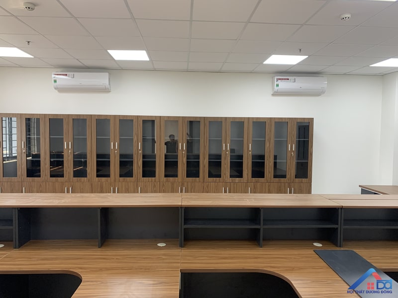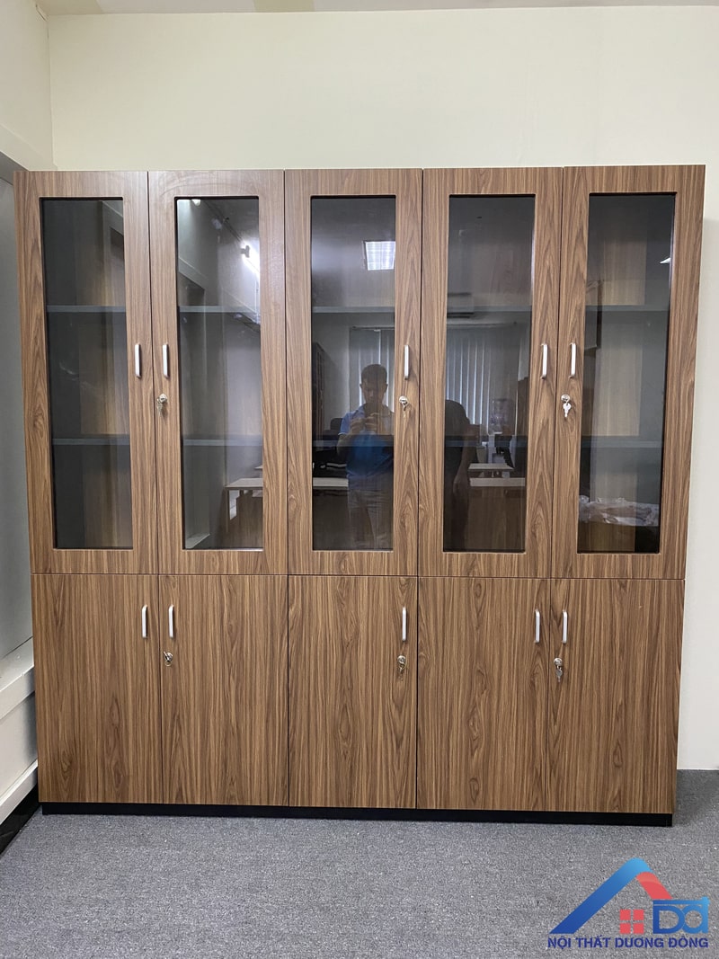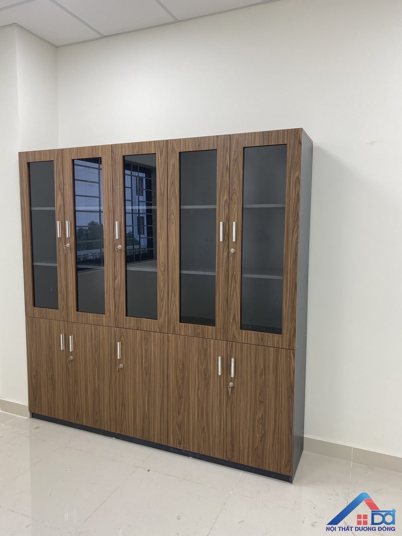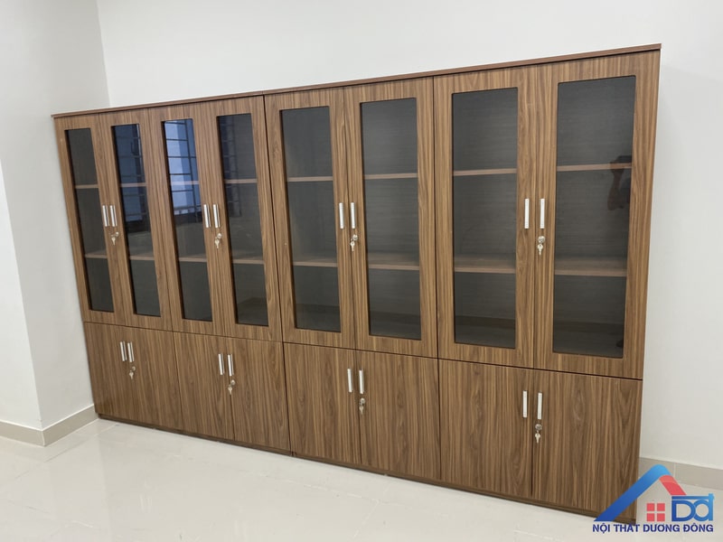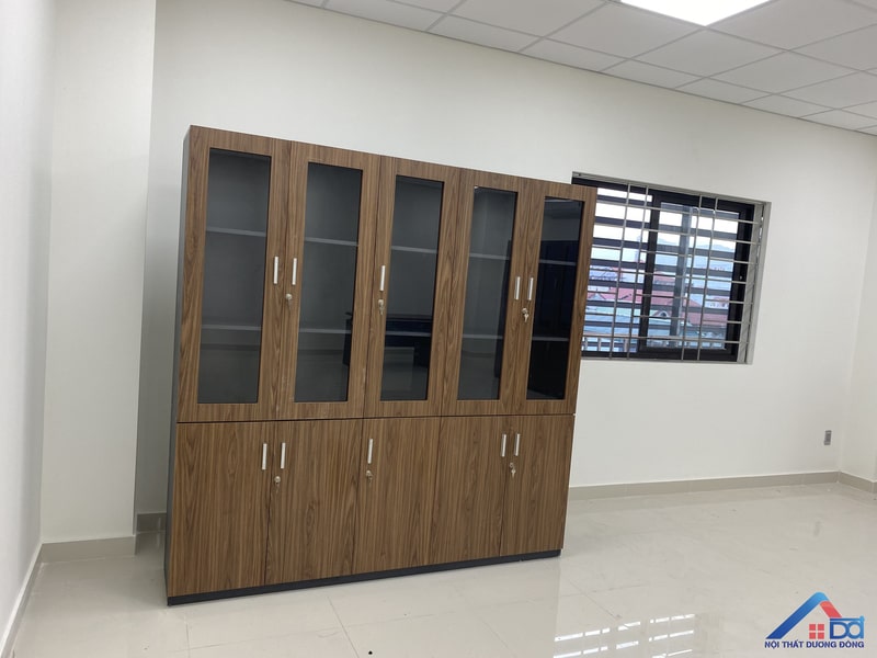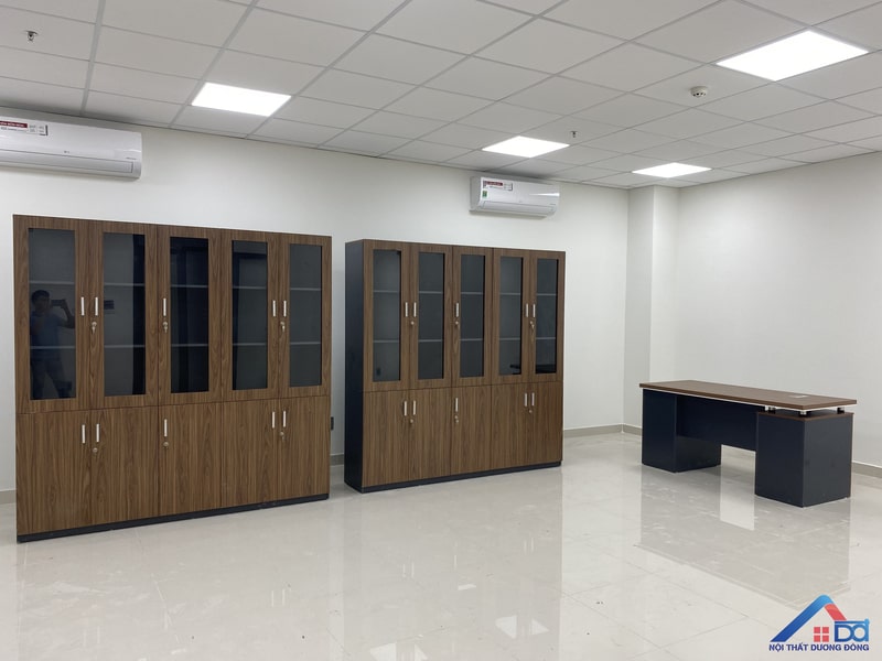 - Dãy tủ hồ sơ được bố trí dọc theo tường, có thiết kế cửa kính giúp dễ dàng quan sát và quản lý tài liệu.