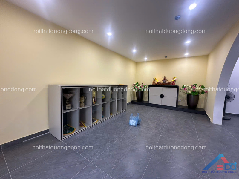 Bên cạnh các không gian chức năng hiện đại, phòng thờ trong trung tâm đào tạo bóng đá trẻ Nghệ An được thi công với sự cẩn trọng và tôn trọng yếu tố truyền thống. Nội thất Dương Đông đã khéo léo kết hợp phong cách hiện đại với sự trang nghiêm cần thiết, tạo nên không gian yên tĩnh, mang giá trị tinh thần sâu sắc. Việc bố trí nội thất phòng thờ đảm bảo sự gọn gàng, trang trọng và hài hòa với tổng thể kiến trúc, góp phần tạo nên sự cân bằng giữa đời sống tinh thần và hoạt động đào tạo thể thao.
