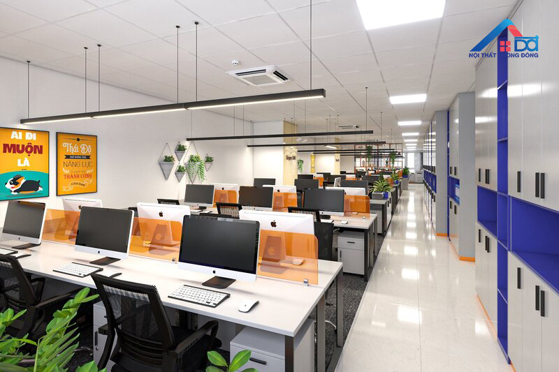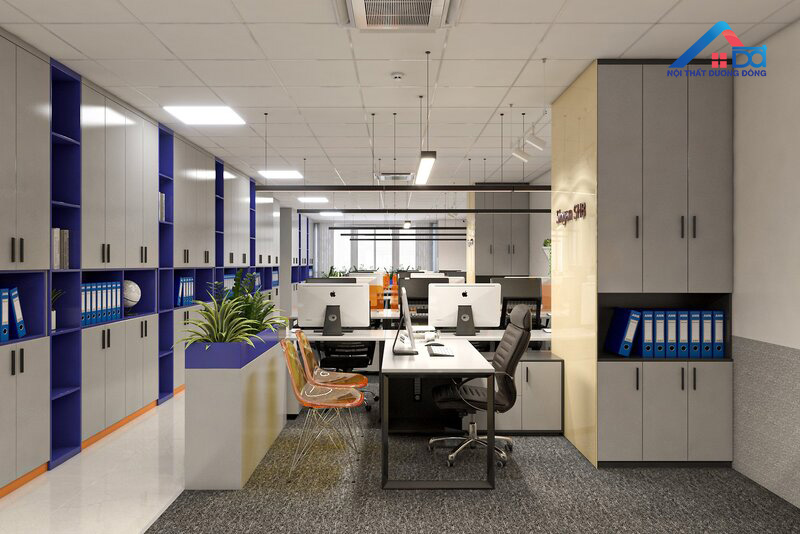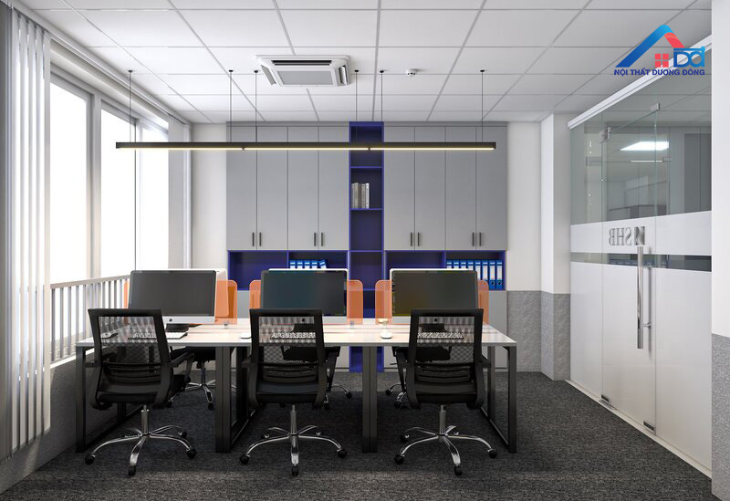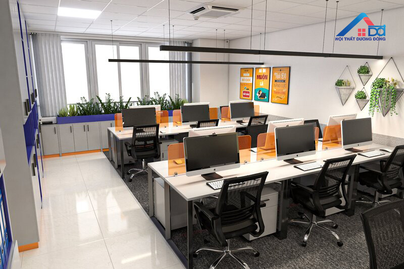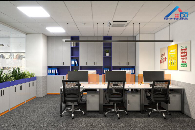 Ở khu vực phòng giám đốc, Dương Đông tập trung vào thiết kế sang trọng nhưng không phô trương. Hệ thống bàn làm việc, tủ tài liệu và ghế điều hành được chọn lựa dựa trên tiêu chí hiện đại – tiện nghi – bền vững. Điểm nhấn sắc cam được đưa vào một cách tinh tế qua các chi tiết trang trí, giúp không gian vừa đậm dấu ấn thương hiệu vừa giữ được tính trang nhã cần có của phòng lãnh đạo.