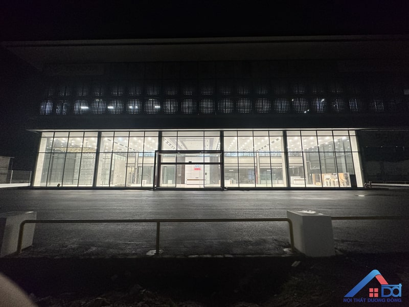 Không gian showroom rộng rãi và hệ thống cửa kính chịu lực văn phòng hiện đại