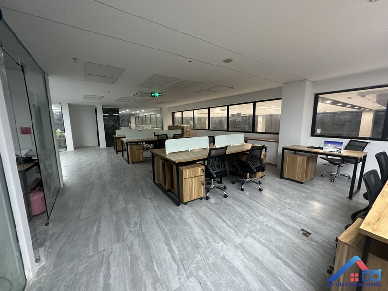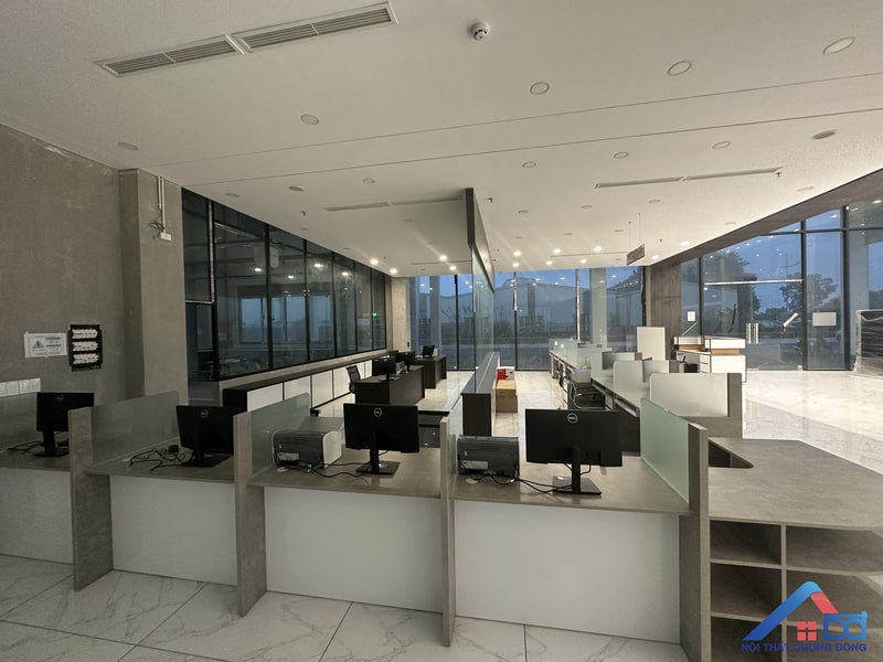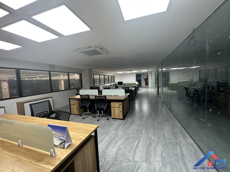 Hệ thống bàn ghế được bố trí khoa học, đảm bảo sự thoải mái cho nhân viên khi làm việc. Không gian làm việc thoáng đãng, có sự phân khu hợp lý giữa các khu vực chức năng, tạo điều kiện tối ưu cho hiệu suất làm việc.