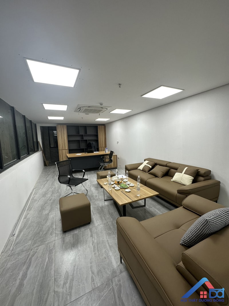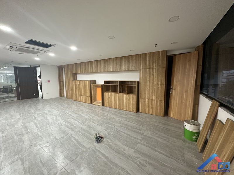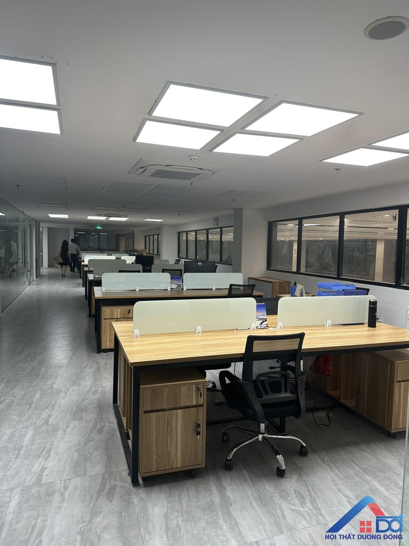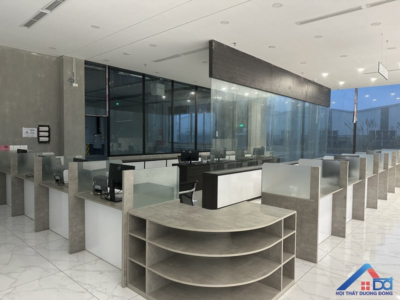 Hệ thống bàn làm việc, tủ hồ sơ, vách ngăn… đều sử dụng gỗ công nghiệp cao cấp, mang lại vẻ đẹp đồng bộ và hiện đại. Chất liệu này không chỉ đảm bảo độ bền mà còn giúp tối ưu chi phí thi công. -