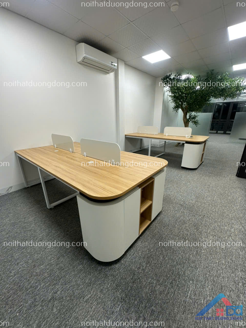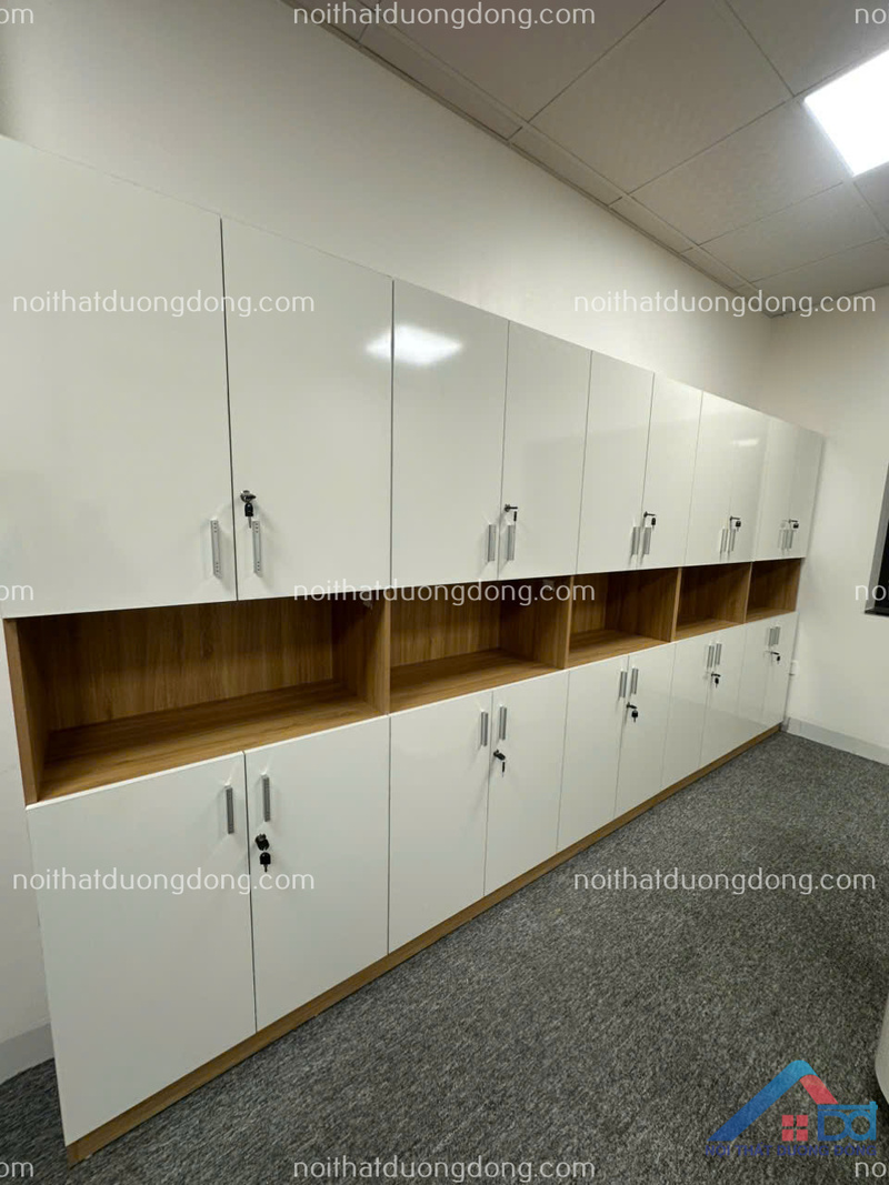 Đi kèm mỗi khu vực bàn làm việc là tủ đựng tài liệu cá nhân được thiết kế đồng bộ về chất liệu và màu sắc. Tủ sử dụng gỗ MDF, kiểu dáng đơn giản, kích thước vừa vặn, giúp nhân viên dễ dàng lưu trữ hồ sơ, giấy tờ và đồ dùng cá nhân. Việc bố trí tủ khoa học không chỉ giúp tiết kiệm diện tích mà còn giữ cho không gian chung luôn gọn gàng, ngăn nắp. Đây là yếu tố quan trọng giúp nâng cao tính chuyên nghiệp của văn phòng và tạo tâm lý thoải mái cho người làm việc.