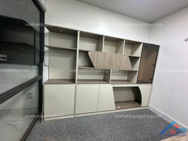 Không gian phòng lãnh đạo được hoàn thiện với tủ tài liệu giám đốc thiết kế riêng, đồng bộ với bàn làm việc. Tủ có kích thước lớn, chia ngăn hợp lý, đáp ứng nhu cầu lưu trữ tài liệu quan trọng, hồ sơ mật cũng như các vật phẩm trang trí, bằng khen, giải thưởng. Việc sử dụng gỗ MDF giúp tủ có độ bền cao, hình thức đẹp và dễ bảo trì. Cách bố trí tủ sát tường vừa tiết kiệm diện tích, vừa tạo nên bố cục không gian cân đối, sang trọng.