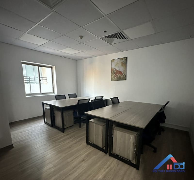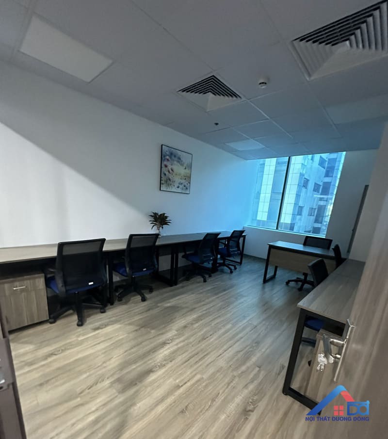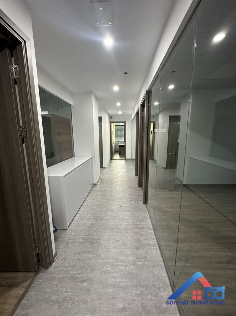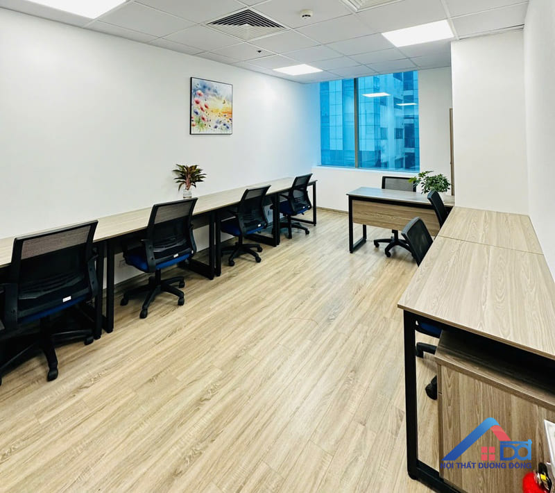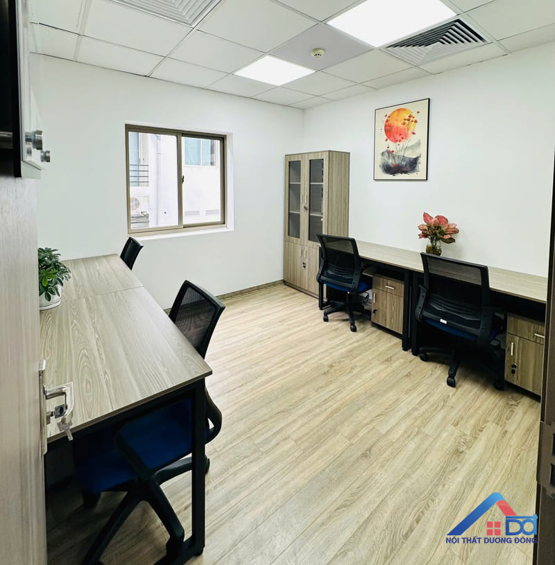 Khu vực phòng làm việc là nơi phản ánh rõ nét nhất triết lý thiết kế của dự án: hiện đại – tối ưu – hiệu quả. Nội thất Dương Đông đã lựa chọn giải pháp bố trí không gian khoa học, tận dụng tối đa diện tích nhưng vẫn đảm bảo sự thông thoáng và thoải mái cho nhân sự. Hệ bàn làm việc được thi công từ gỗ MDF, thiết kế đơn giản, gọn gàng, phù hợp với môi trường văn phòng năng động. Các module bàn được bố trí hợp lý, tạo sự kết nối giữa các nhân viên nhưng vẫn đảm bảo không gian làm việc cá nhân cần thiết. Tủ tài liệu, hộc lưu trữ được tích hợp thông minh, giúp tối ưu diện tích và giữ cho không gian luôn ngăn nắp.
