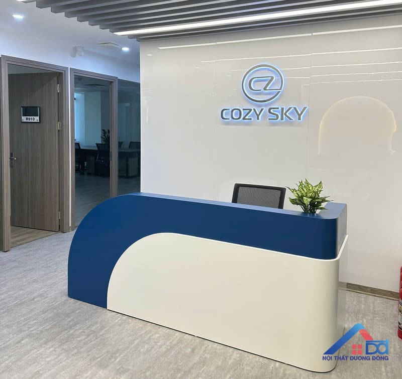 Quầy lễ tân là khu vực đầu tiên khách hàng, đối tác tiếp cận khi bước vào văn phòng, vì vậy không gian này được Dương Đông đặc biệt chú trọng trong cả thiết kế lẫn thi công. Quầy lễ tân tại Cozy Sky Duy Tân sử dụng chất liệu MDF cao cấp, bề mặt hoàn thiện phẳng mịn, kết hợp màu sắc trung tính mang hơi hướng hiện đại. Thiết kế quầy gọn gàng, hình khối rõ ràng, tạo cảm giác chuyên nghiệp nhưng vẫn thân thiện. Logo thương hiệu được bố trí tinh tế phía sau quầy, giúp tăng khả năng nhận diện và tạo điểm nhấn thị giác ngay từ ánh nhìn đầu tiên.