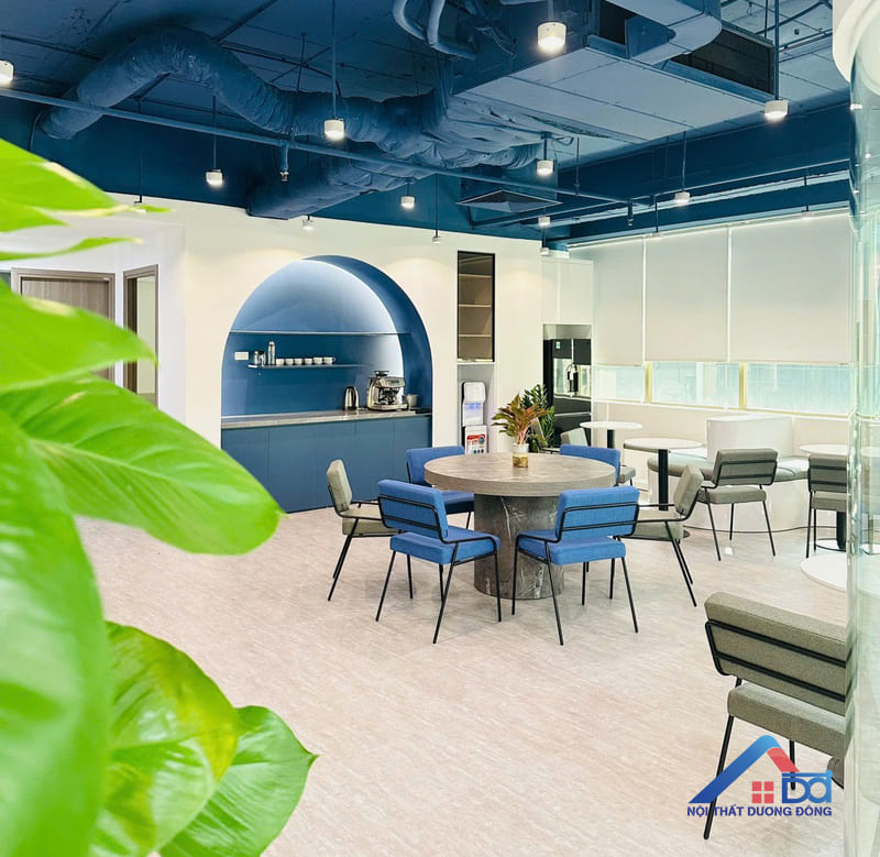 Bên cạnh các không gian làm việc chính, phòng pantry cũng là hạng mục được Dương Đông đầu tư chỉn chu. Đây là nơi nhân viên nghỉ ngơi, thư giãn, tái tạo năng lượng sau những giờ làm việc căng thẳng. Nội thất pantry sử dụng gỗ MDF với thiết kế hiện đại, gọn gàng. Hệ tủ, kệ được bố trí khoa học, đáp ứng nhu cầu sử dụng hàng ngày như pha trà, cà phê, lưu trữ đồ dùng. Không gian pantry tuy không quá lớn nhưng được xử lý tinh tế, mang lại cảm giác ấm cúng, gần gũi.