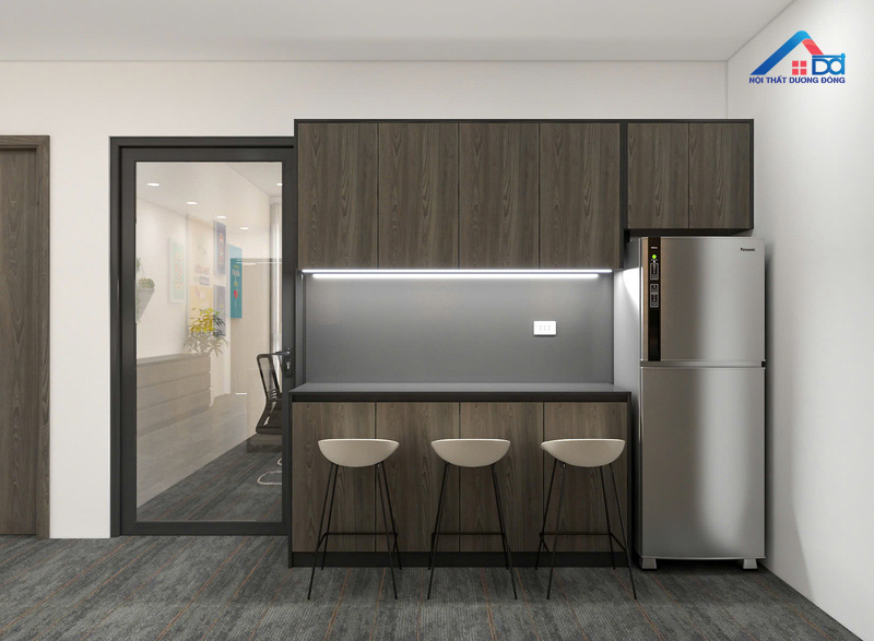 Không chỉ tập trung vào không gian làm việc, Dương Đông còn thiết kế phòng pantry như một điểm nhấn giúp cân bằng trải nghiệm của nhân viên. Khu vực được bố trí quầy bar nhỏ, hệ tủ kệ hiện đại cùng chỗ ngồi thư giãn tiện nghi. Tone màu nhẹ nhàng, kết hợp với ánh sáng ấm giúp nơi đây trở thành “khoảng nghỉ” lý tưởng, góp phần tăng động lực và tinh thần cho đội ngũ nhân sự.