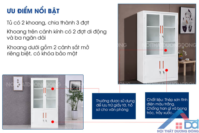 + Các khoang trong tủ được phân chia đều và phù hợp. Với 2 đợt và chia thành 3 khoang khu vực cửa kính. Cửa sắt được chia thành 2 ngăn với 2 khóa riêng biệt. Tất cả đều tạo nên sự tiện dụng cho việc sử dụng của nội thất văn phòng.